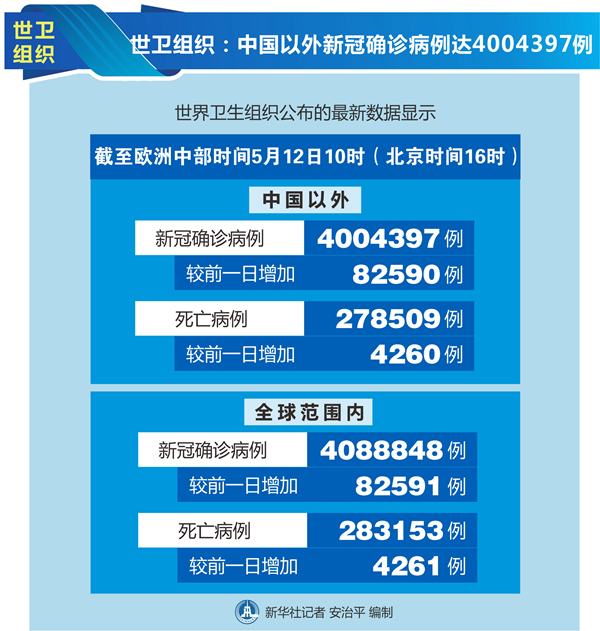 世衛(wèi)組織每日疫情報(bào)告顯示,截至歐洲中部時(shí)間12日10時(shí)(北京時(shí)間16時(shí)),中國(guó)以外確診病例較前一日增加82590例,達(dá)到4004397例;中國(guó)以外死亡病例較前一日增加4260例,達(dá)到278509例。