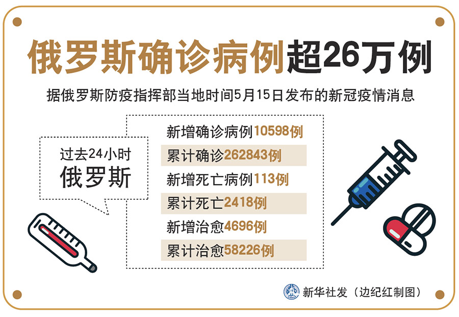 新華社莫斯科5月15日電(記者魯金博)據(jù)俄羅斯防疫指揮部15日發(fā)布的新冠疫情消息,過去24小時俄新增確診病例10598例,累計確診262843例;新增死亡病例113例,累計死亡2418例;新增治愈4696例,累計治愈58226例。