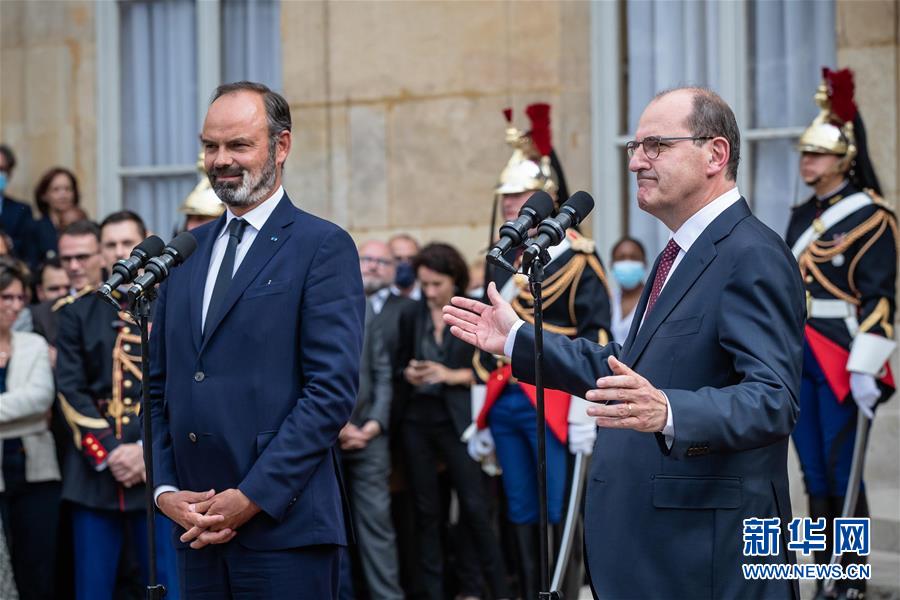 7月3日,在法國巴黎總理府,卸任總理愛德華·菲利普(左)與新任總理讓·卡斯泰出席權(quán)力交接儀式。新華社發(fā)(奧雷利安·莫里薩爾 攝)