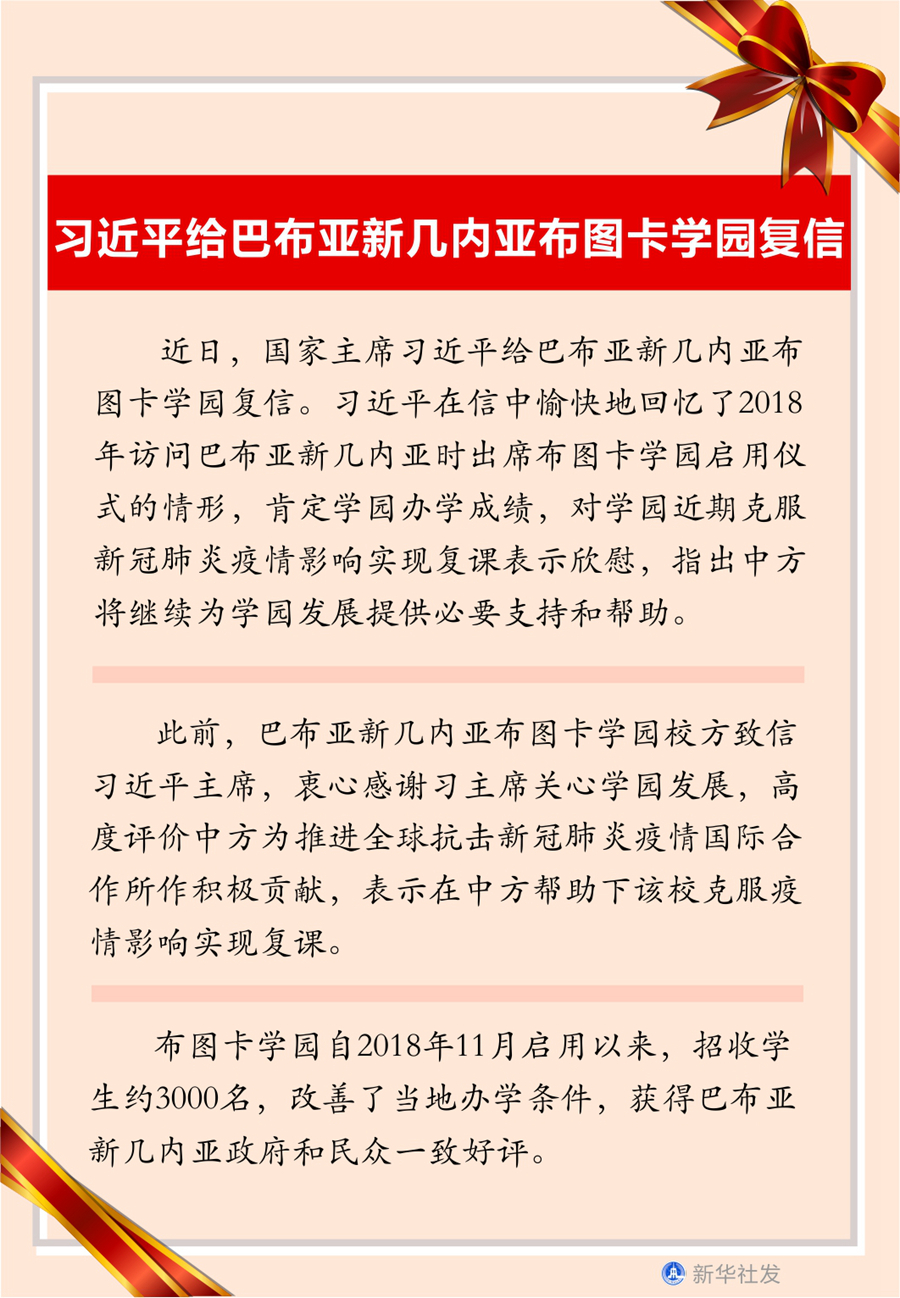 此前,巴布亞新幾內(nèi)亞布圖卡學(xué)園校方致信習(xí)近平主席,衷心感謝習(xí)主席關(guān)心學(xué)園發(fā)展,高度評價中方為推進全球抗擊新冠肺炎疫情國際合作所作積極貢獻,表示在中方幫助下該校克服疫情影響實現(xiàn)復(fù)課。
