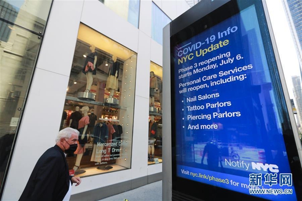 7月4日,一名行人從美國紐約第五大道顯示新冠疫情最新情況的信息屏旁經(jīng)過。新華社記者 王迎 攝