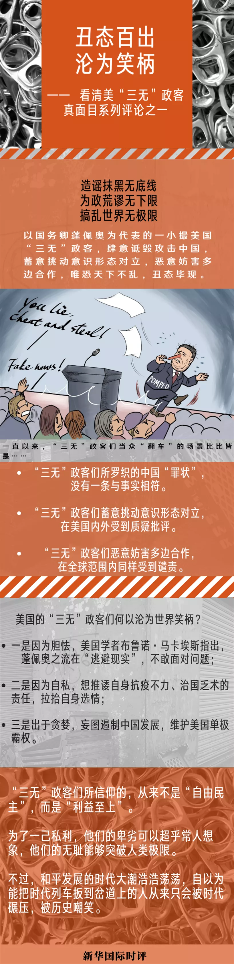 一段時間以來,以國務卿蓬佩奧為代表的一小撮造謠抹黑無底線、為政荒謬無下限、搞亂世界無極限的美國“三無”政客,肆意詆毀攻擊中國,蓄意挑動意識形態(tài)對立,惡意妨害多邊合作,唯恐天下不亂,丑態(tài)畢現(xiàn)。