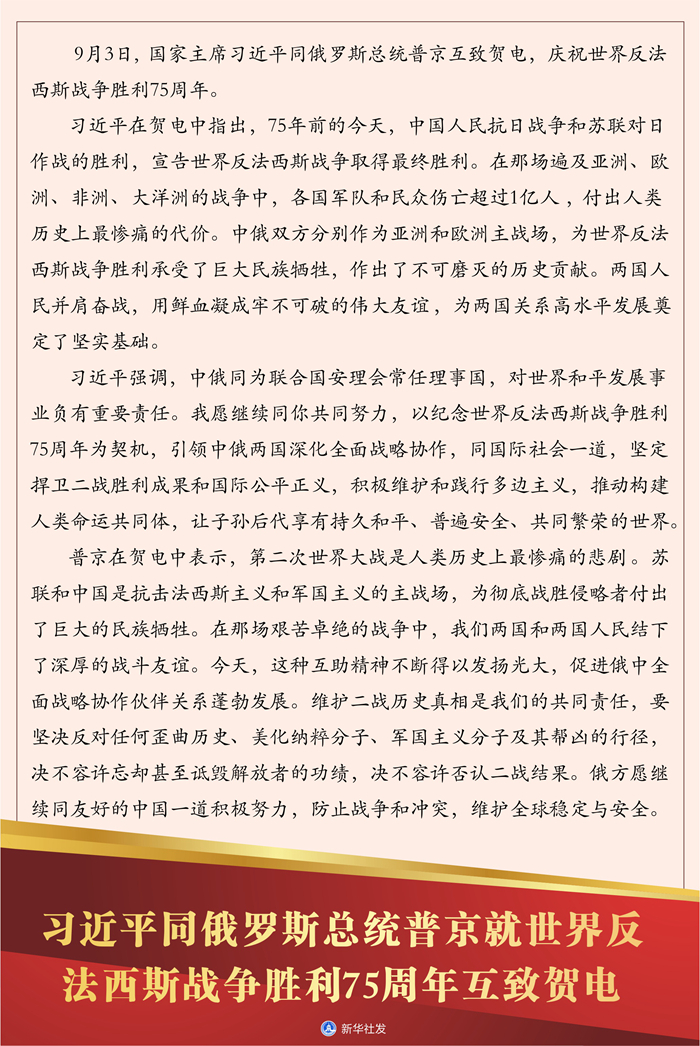 習(xí)近平在賀電中指出,75年前的今天,中國人民抗日戰(zhàn)爭和蘇聯(lián)對(duì)日作戰(zhàn)的勝利,宣告世界反法西斯戰(zhàn)爭取得最終勝利。在那場(chǎng)遍及亞洲、歐洲、非洲、大洋洲的戰(zhàn)爭中,各國軍隊(duì)和民眾傷亡超過1億人,付出人類歷史上最慘痛的代價(jià)。中俄雙方分別作為亞洲和歐洲主戰(zhàn)場(chǎng),為世界反法西斯戰(zhàn)爭勝利承受了巨大民族犧牲,作出了不可磨滅的歷史貢獻(xiàn)。兩國人民并肩奮戰(zhàn),用鮮血凝成牢不可破的偉大友誼,為兩國關(guān)系高水平發(fā)展奠定了堅(jiān)實(shí)基礎(chǔ)。