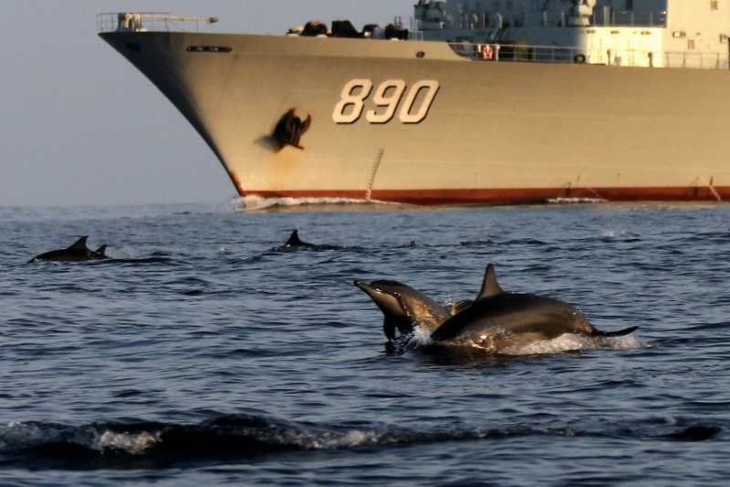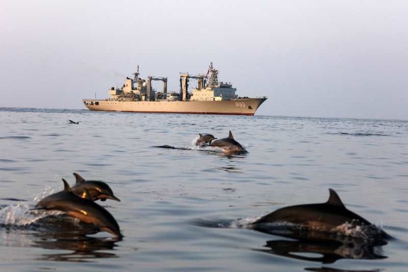 中國海軍赴亞丁灣索馬里海域護(hù)航編隊(duì)始終秉持海洋命運(yùn)共同體理念,堅(jiān)持人與大海和諧相處,注重生態(tài)環(huán)境保護(hù),贏得大自然積極回報(bào),經(jīng)常出現(xiàn)編隊(duì)艦艇航行時(shí)有成群海豚伴航、待機(jī)集結(jié)時(shí)有各類魚群相伴的和諧場景。