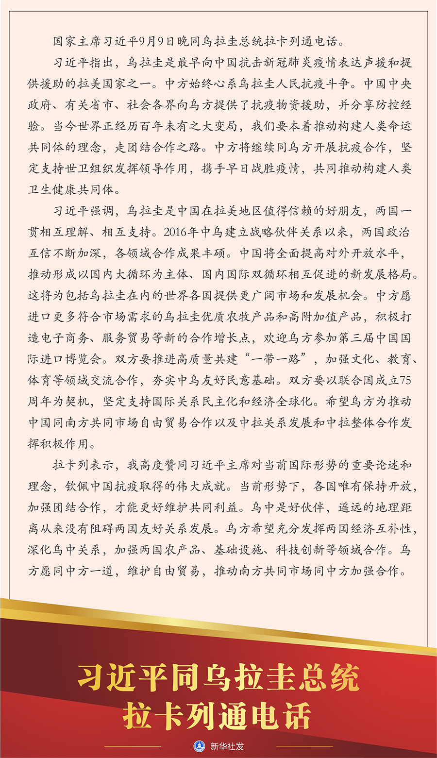 新華社北京9月9日電? 國家主席習近平9月9日晚同烏拉圭總統(tǒng)拉卡列通電話。
