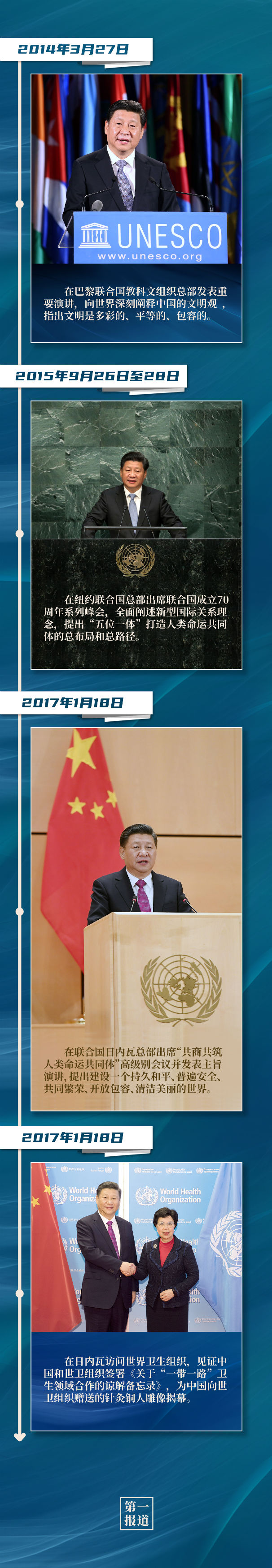 紐約聯(lián)合國總部、聯(lián)合國日內(nèi)瓦總部、聯(lián)合國教科文組織總部、世界衛(wèi)生組織,這些地方都留下了習(xí)主席的訪問足跡。站在聯(lián)合國講臺,習(xí)主席闡述關(guān)于促進(jìn)世界和平發(fā)展的重要主張,表達(dá)對聯(lián)合國事業(yè)的堅(jiān)定支持,傳遞攜手各方應(yīng)對全球挑戰(zhàn)、深化多邊合作的真誠意愿。