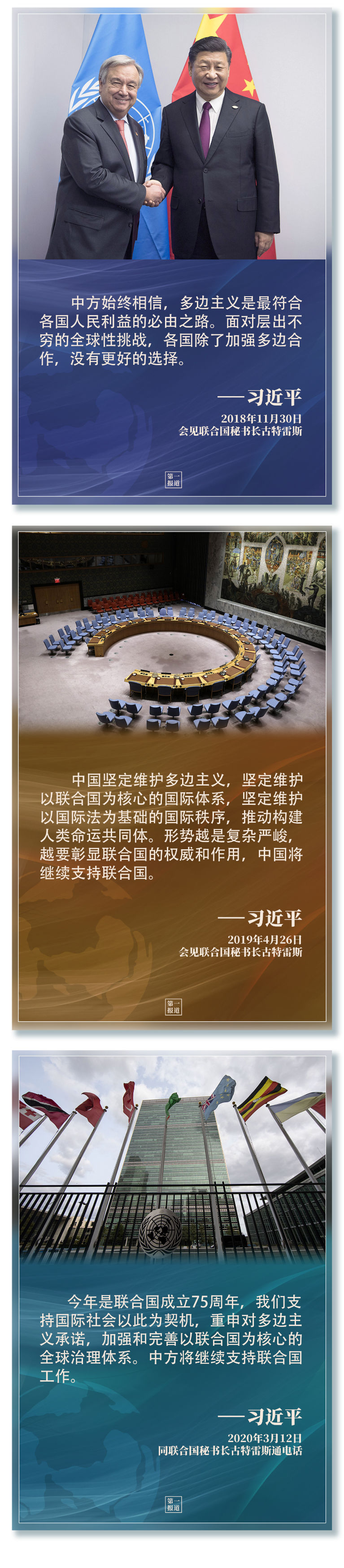 習(xí)主席指出,“支持聯(lián)合國發(fā)揮作用,維護(hù)聯(lián)合國權(quán)威和地位,是中國外交一項(xiàng)基本政策?!?/strong>2013年以來,習(xí)主席多次會見聯(lián)合國主要官員,訪問聯(lián)合國總部及聯(lián)合國專門機(jī)構(gòu),出席一系列聯(lián)合國活動……親自推動中國同聯(lián)合國的合作,發(fā)出支持聯(lián)合國事業(yè)、捍衛(wèi)多邊主義的中國強(qiáng)音。
