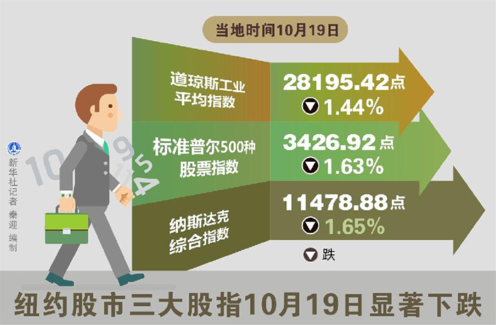 新華社快訊:紐約股市三大股指19日下跌,其中,道指跌1.44%,標普指數(shù)跌1.63%,納斯達克指數(shù)跌1.65%。
