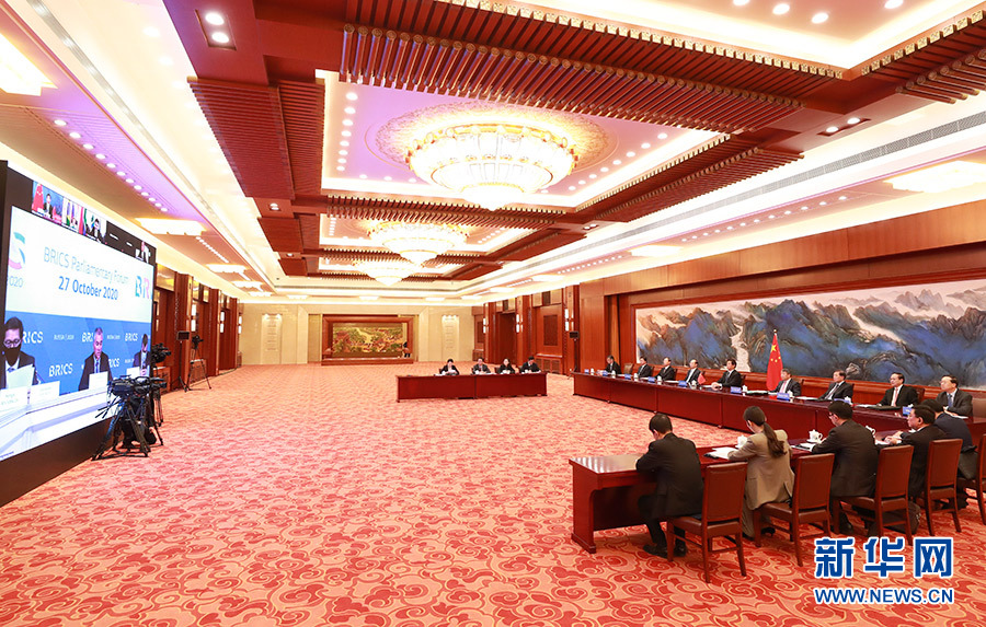 新華社北京10月27日電 全國(guó)人大常委會(huì)委員長(zhǎng)栗戰(zhàn)書27日在北京人民大會(huì)堂出席第六屆金磚國(guó)家議會(huì)論壇視頻會(huì)議并發(fā)表講話。