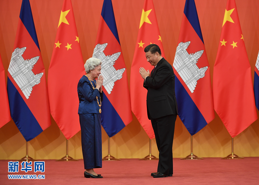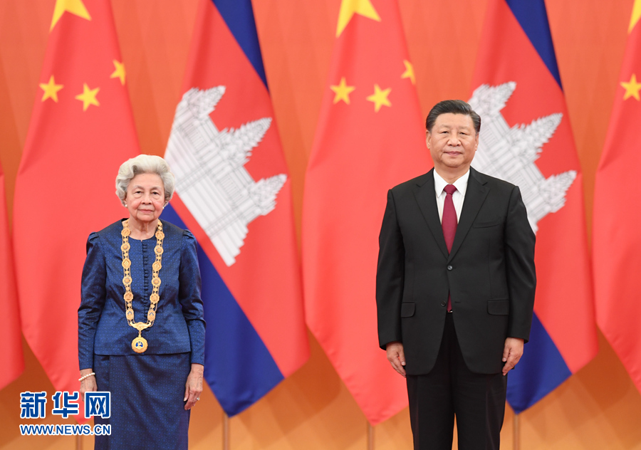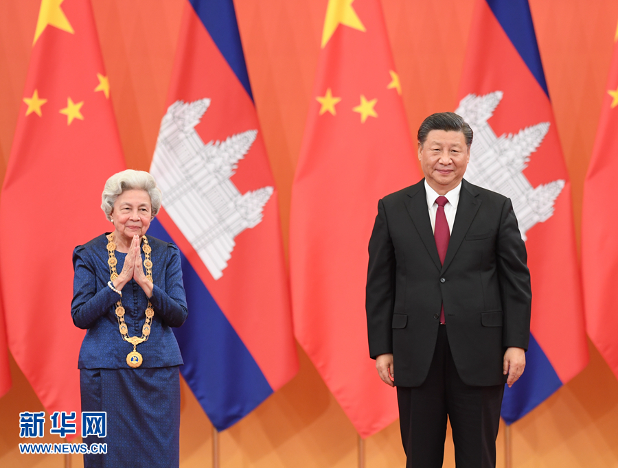 11月6日,國家主席習(xí)近平在北京人民大會堂為柬埔寨太后莫尼列舉行中華人民共和國“友誼勛章”頒授儀式。 新華社記者 申宏 攝