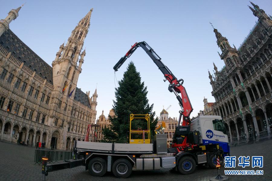 這是11月19日在比利時布魯塞爾大廣場拍攝的圣誕樹安裝現(xiàn)場。
