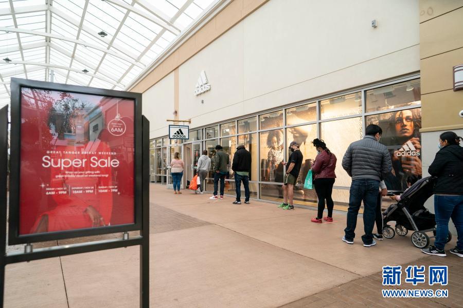 11月27日,人們?cè)诿绹?guó)馬里蘭州國(guó)家港灣一處購(gòu)物中心排隊(duì)等待進(jìn)店購(gòu)物。