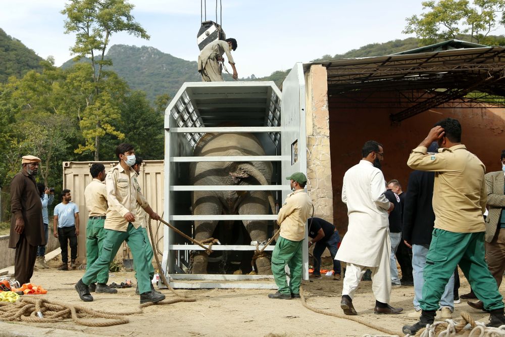 ↑11月29日,在巴基斯坦伊斯蘭堡,工作人員搬運裝有大象的運輸箱