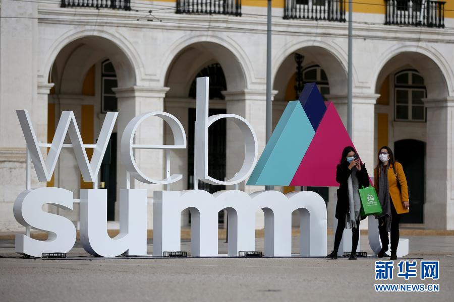 11月30日,在葡萄牙里斯本,兩名戴口罩的女子走過2020年網(wǎng)絡(luò)峰會的立體標(biāo)識。