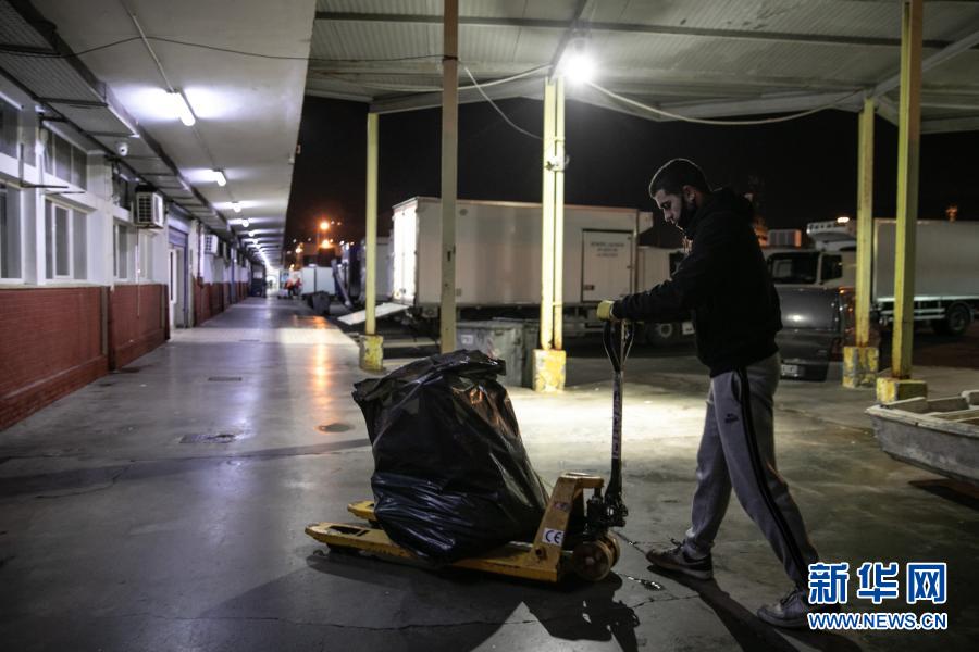 12月17日,在希臘比雷埃夫斯地區(qū)一處港口,一名工作人員收集剛從漁船上卸下的塑料垃圾。新華社發(fā)(萊夫特里斯·帕察里斯攝)