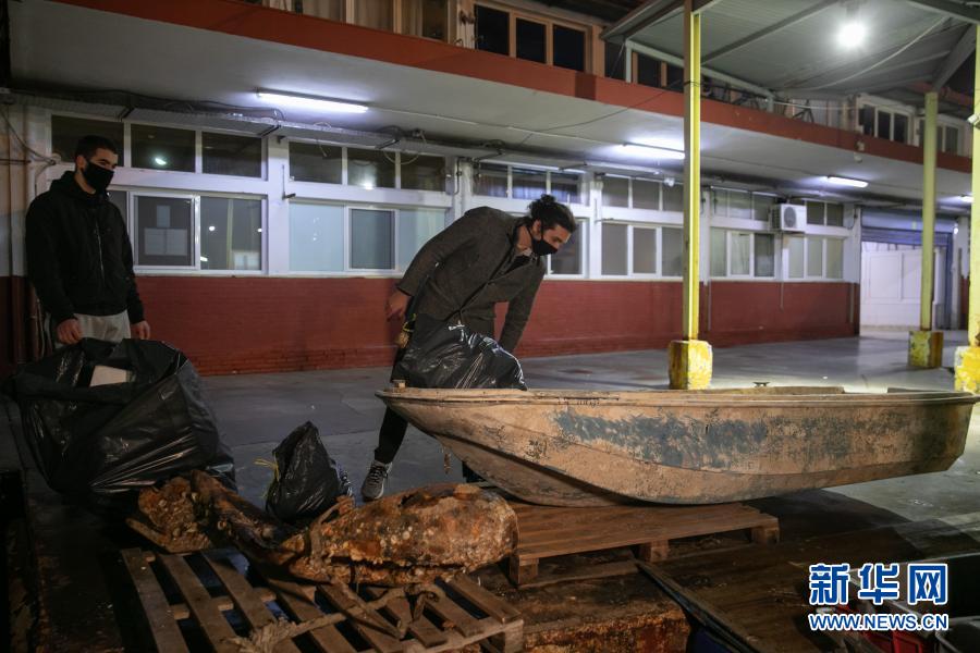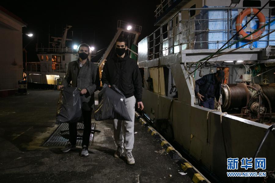 12月17日,在希臘比雷埃夫斯地區(qū)一處港口,阿拉帕基斯(左)與同事一同收集剛從漁船上卸下的塑料垃圾。新華社發(fā)(萊夫特里斯·帕察里斯攝)