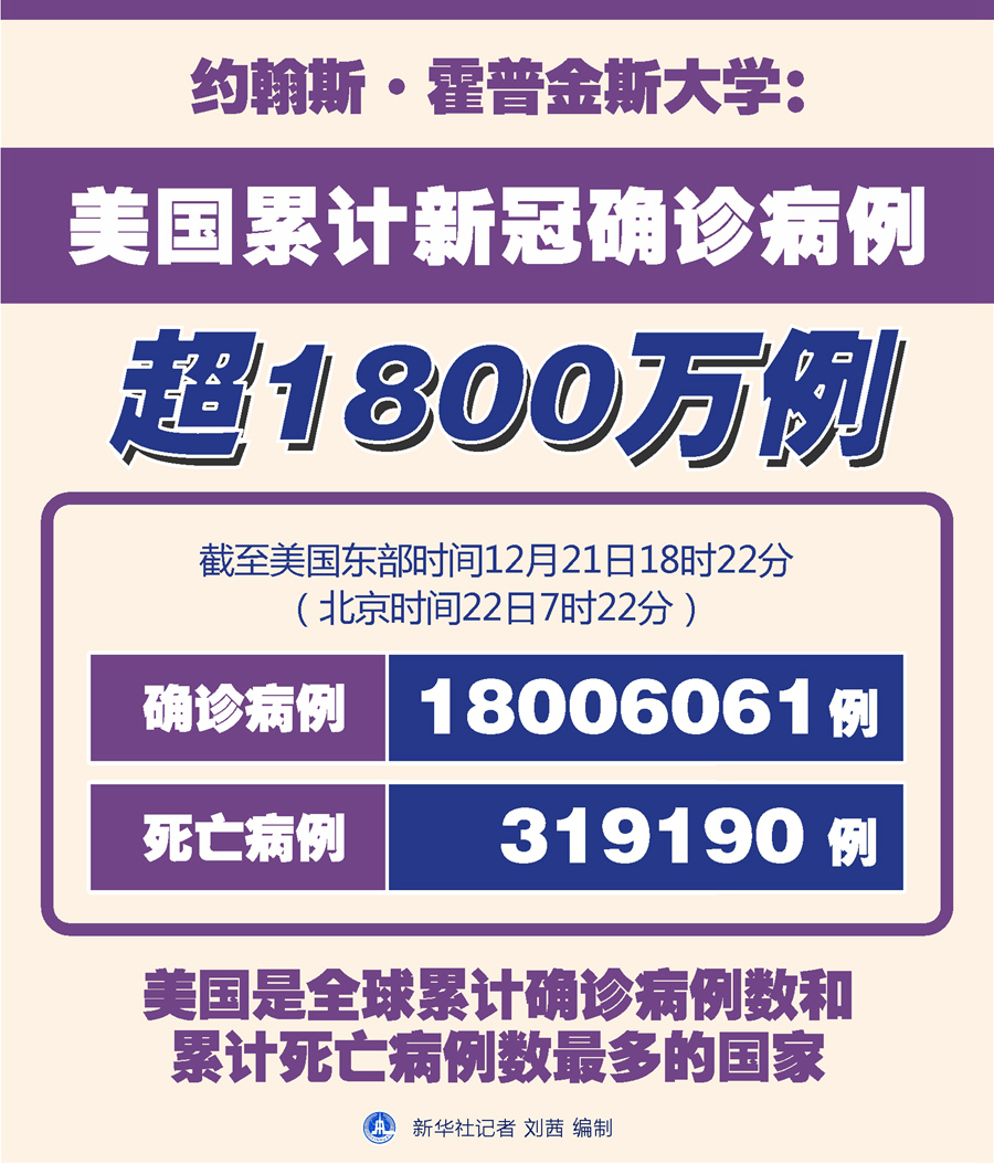 新華社紐約12月21日電 美國(guó)約翰斯·霍普金斯大學(xué)21日發(fā)布的新冠疫情最新統(tǒng)計(jì)數(shù)據(jù)顯示,美國(guó)累計(jì)確診病例超過(guò)1800萬(wàn)例。