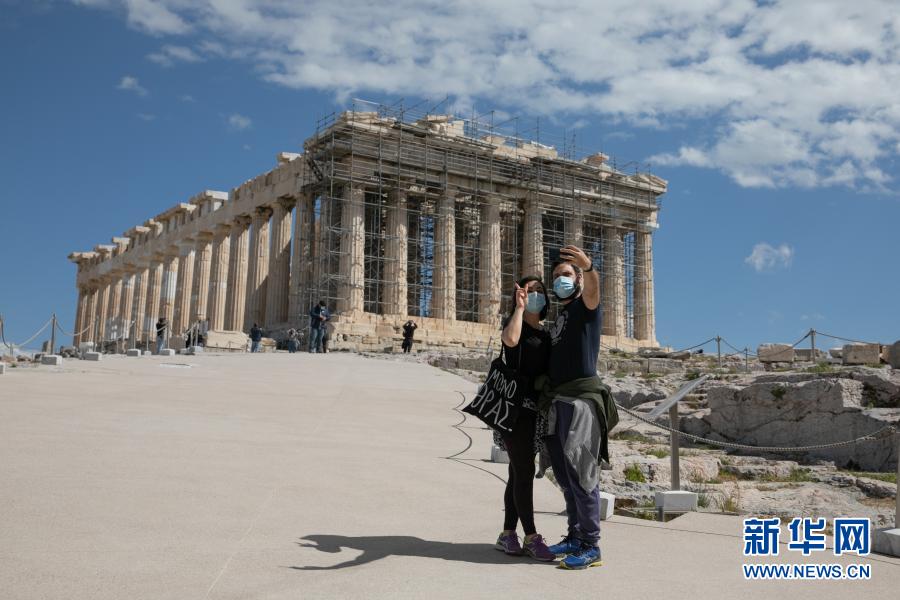 3月22日,游客在希臘雅典衛(wèi)城自拍。希臘露天考古遺跡22日起恢復開放。游客需遵守保持社交距離和佩戴口罩等防疫規(guī)定。新華社發(fā)(萊夫特里斯·帕察里斯攝)