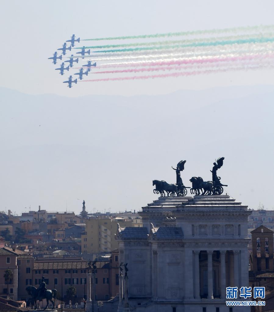 當(dāng)日,意大利“三色箭”飛行表演隊(duì)在意大利首都羅馬舉行飛行表演,慶祝意大利空軍建立98周年。