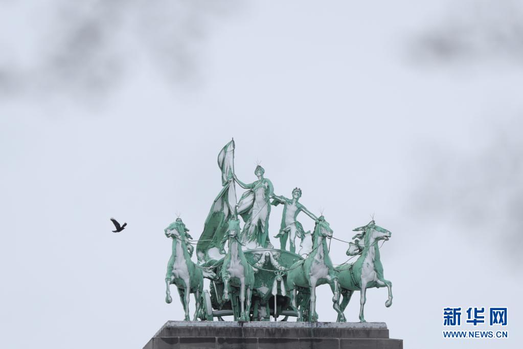4月7日,比利時(shí)布魯塞爾五十周年紀(jì)念公園中央拱門上的雕塑被積雪覆蓋。
