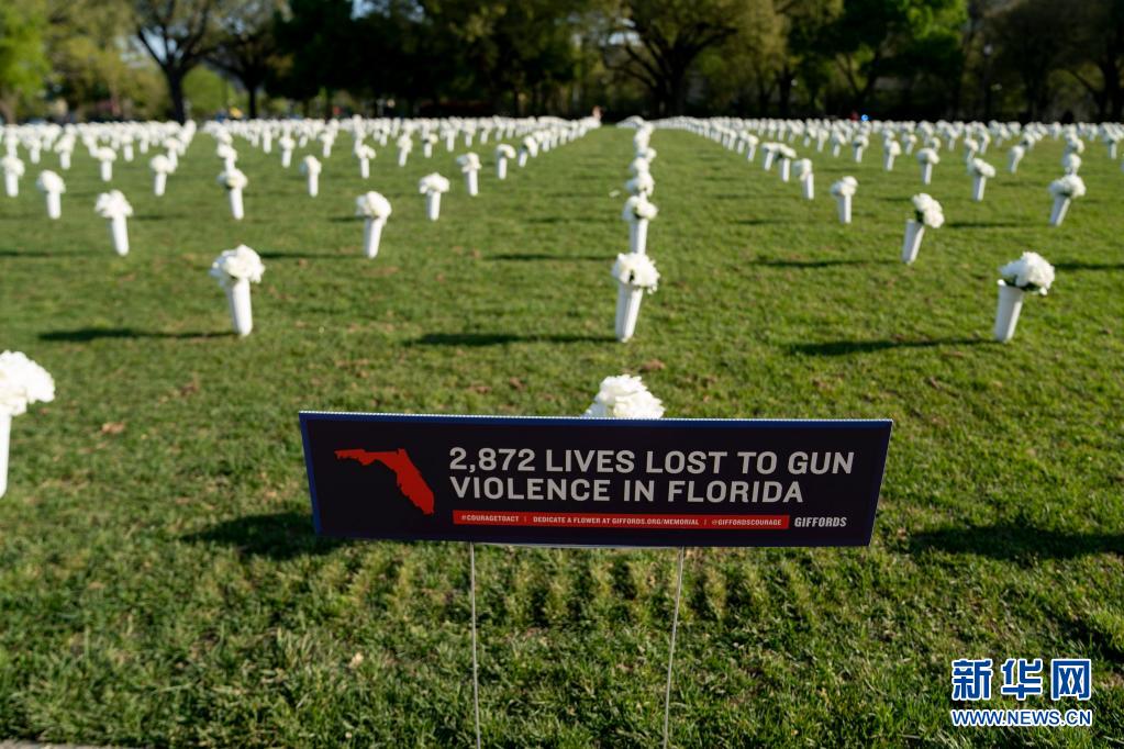 4月13日,一塊標(biāo)牌豎立在美國(guó)華盛頓國(guó)家廣場(chǎng)草坪上,顯示美國(guó)佛羅里達(dá)州共有2872人死于槍擊事件。
