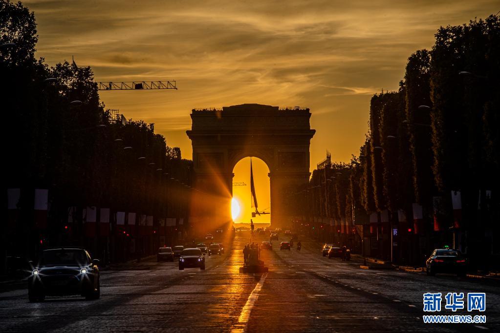 這是5月8日在法國(guó)巴黎香榭麗舍大街拍攝的凱旋門(mén)落日景象。