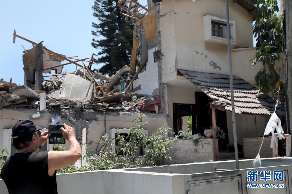 5月13日,一名男子在以色列中部城市耶胡德拍攝被火箭彈擊中損毀的房屋。
