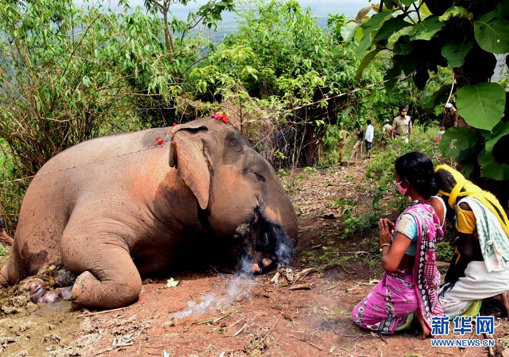 5月14日,人們?cè)谟《劝⑺_姆邦納加奧恩地區(qū)一頭死去的象旁禱告。