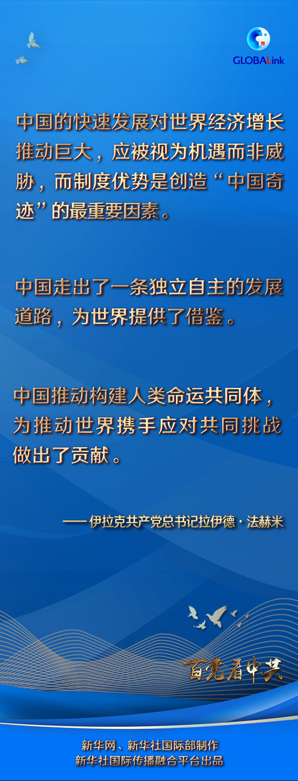 法赫米表示,中國走出了一條獨立自主的發(fā)展道路,為世界提供了借鑒。全世界都在關(guān)注中國的發(fā)展道路、發(fā)展成就以及中國對建設(shè)社會主義的探索。近年來,伊拉克共產(chǎn)黨與中國共產(chǎn)黨保持了密切聯(lián)系,我們希望能夠從中共的執(zhí)政理念和中國的發(fā)展經(jīng)驗中汲取智慧,以助力本國發(fā)展。