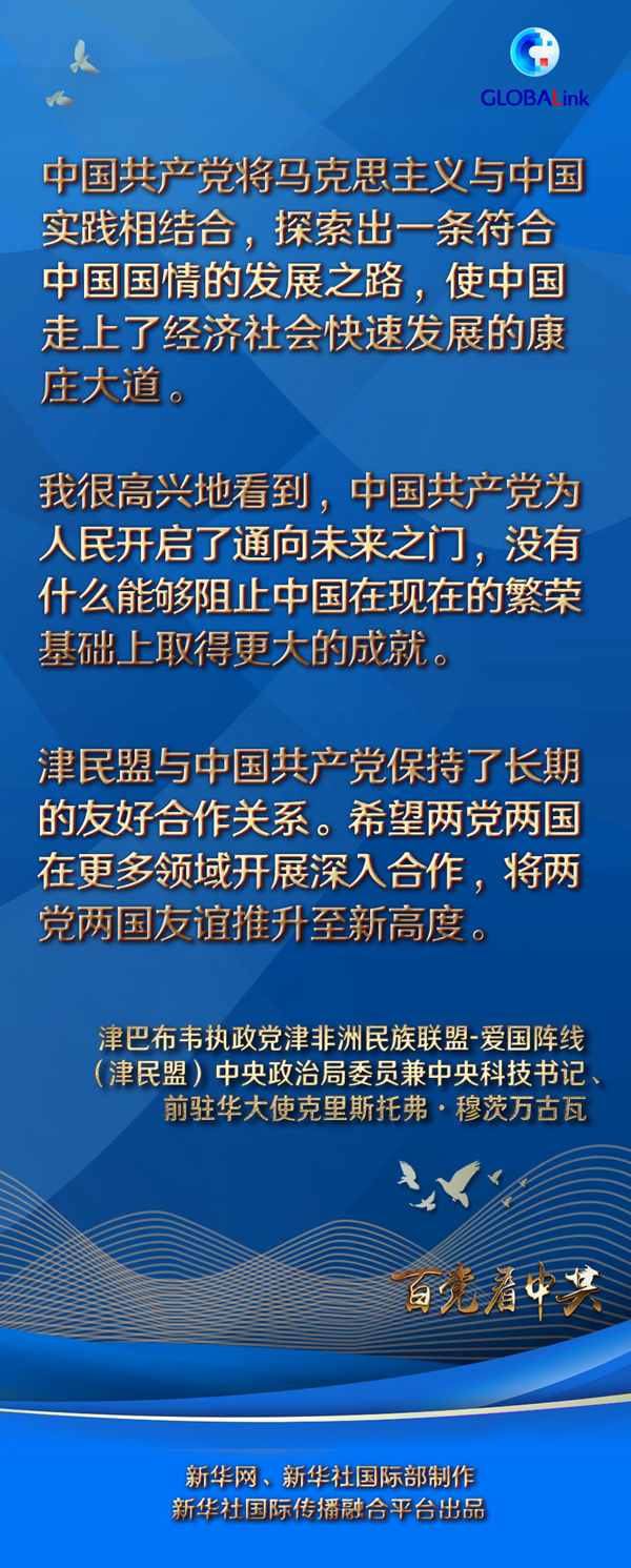 “我很高興地看到,中國(guó)共產(chǎn)黨為人民開(kāi)啟了通向未來(lái)之門,沒(méi)有什么能夠阻止中國(guó)在現(xiàn)在的繁榮基礎(chǔ)上取得更大的成就?!蹦麓娜f(wàn)古瓦說(shuō),津民盟和他本人對(duì)中國(guó)共產(chǎn)黨帶領(lǐng)中國(guó)人民所取得的偉大成就表示贊嘆,祝愿中國(guó)在未來(lái)取得更大的發(fā)展成就。他希望兩黨兩國(guó)在更多領(lǐng)域開(kāi)展深入合作,將兩黨兩國(guó)友誼推升至新高度。