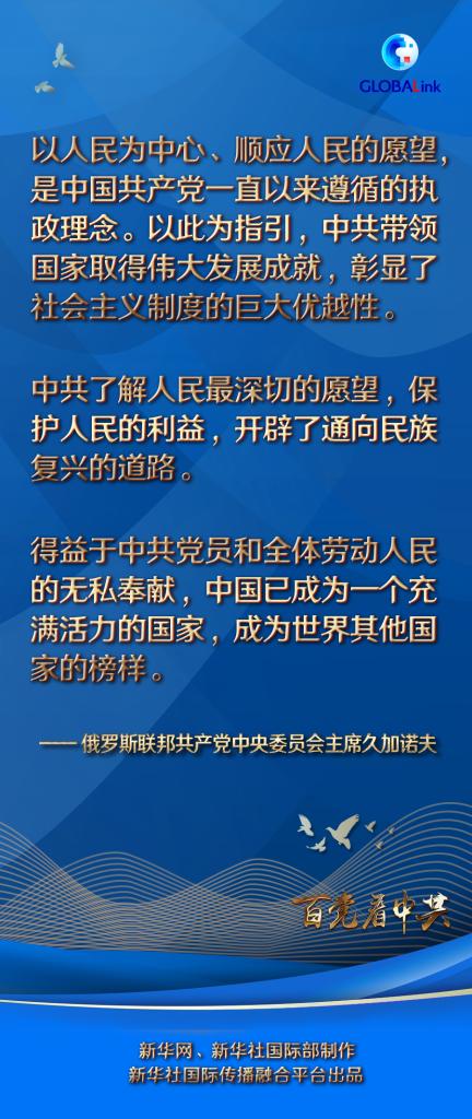 久加諾夫?qū)χ袊?guó)共產(chǎn)黨百年華誕表示祝賀。回顧百年歷程,他表示,中共了解人民最深切的愿望,保護(hù)人民的利益,開辟了通向民族復(fù)興的道路。