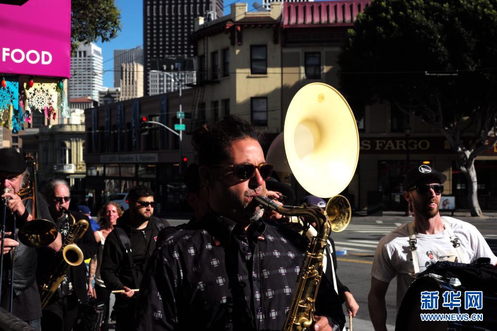6月15日,一支樂隊(duì)在美國加利福尼亞州舊金山街頭演奏。