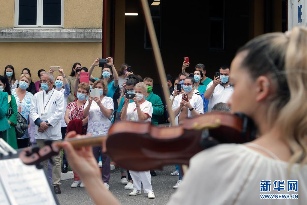 當日,羅馬尼亞首都布加勒斯特一個樂隊在該國一家傳染病醫(yī)院——馬太·巴爾什醫(yī)院演出,向抗擊新冠疫情的醫(yī)務工作者致謝。