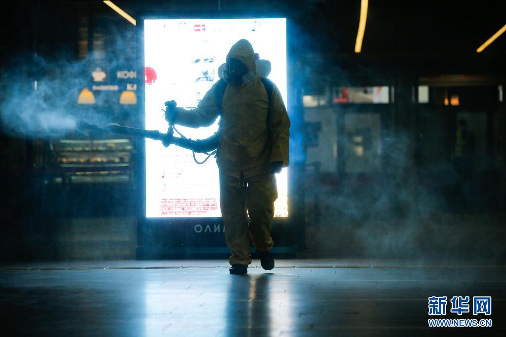 6月24日,工作人員身著防護服在俄羅斯莫斯科一個火車站進行消毒作業(yè)。