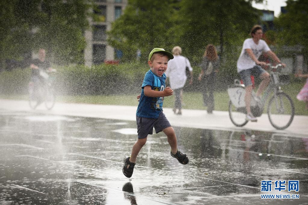 6月26日波蘭首都華沙天氣炎熱,兒童在街頭噴泉戲水。